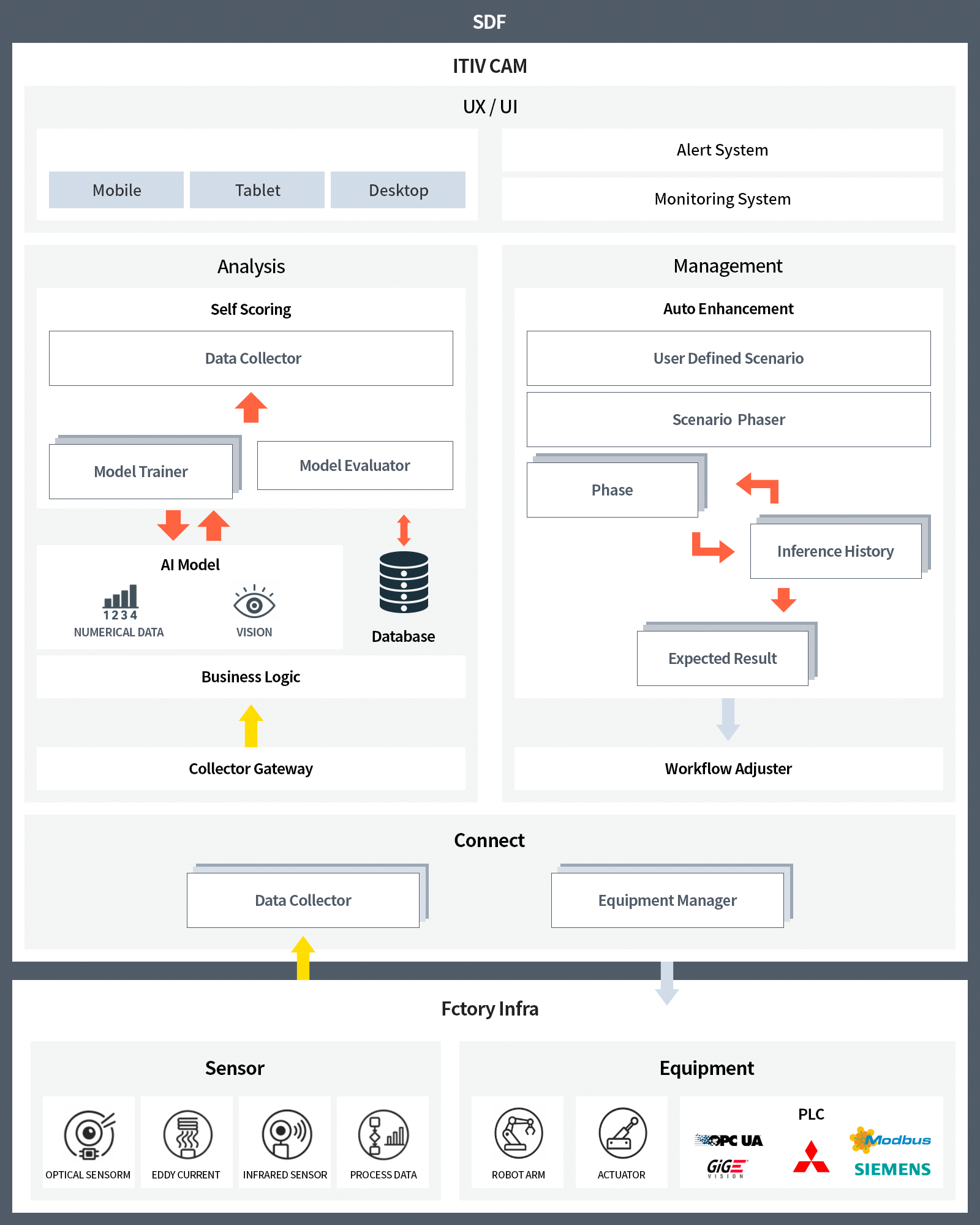 아이티브CAM은 생산 라인에는 필요한 센서만 배치하고, 소형화된 서버는 유·무선 네트워크를 통해 별도 공간에 설치할 수 있습니다.