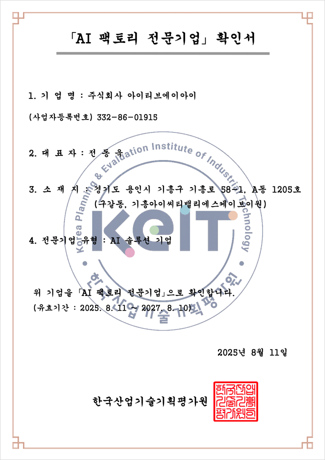 아이티브에이아이는 스마트 제조 분야의 기술력과 혁신성을 인정받아 AI 팩토리 전문기업으로 선정된 신뢰받는 자동화 솔루션 기업입니다.